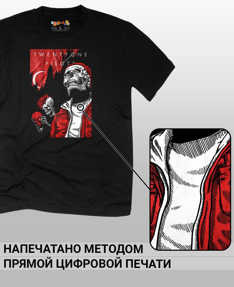Футболка унисекс из 100% хлопка с рок-принтом Twenty One Pilots от бренда Rock-Rock - это идеальный выбор для поклонников группы и всех, кто ценит уникальный стиль. Эта мужская футболка изготовлена из высококачественного хлопка, обеспечивающего комфорт и долговечность. Подходит как мужчинам так и женшинам. Можно носить как оверсайз. Эта майка стильный и универсальный предмет одежды, который олицетворяет энергию и мощь рок-музыки. Уникальный рисунок с изображением Twenty One Pilots на передней части делает эту футболку не только повседневным аксессуаром, но и отличным подарком для друзей и близких. Сочетайте её с джинсами или шортами для создания стильного и современного образа. Футболка унисекс и подходит для мужчин, женщин и подростков, что делает его весьма универсальным. Она имеет свободный и комфортный крой, который можно использовать как oversize или оверсайз. Стильная футба с рок принтом будет прекрасным дополнением вашего образа и подчеркнет вашу индивидуальность. Рисунок, сделанный цифровой печатью, будет свежим акцентом вашего гардероба и привлечет внимание окружающих. Крутой принт добавляет оригинальности и энергии этому стильному предмету гардероба. Молодежная подростковая аудитория, байкеры, увлекающиеся роком, Nirvana, Guns n Roses, панк, Misfits, Nirvana и альтернативными стилями, AC/DC, Metallica оценит этот яркий и стильный вариант одежды. Кроме того, черная или белая мужская футба подходит для любителей эмо одежды, гранж и рок-стиля и её можно использовать как черную женскую футболку.