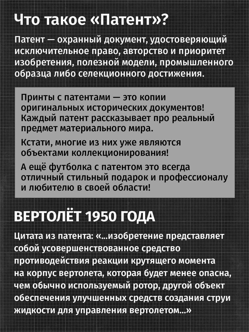 Футболки унисекс, чёрные и белые футболки с изображением патента Вертолёт, 1950 год. Эта модель футболки подходит как мужчинам, так и женщинам, а также адаптируется к различным типам фигуры. Наши принты выполнены методом полноцветной цифровой печати, что обеспечивает высокую износостойкость и насыщенность цветов. Ткань из 100 % хлопка и качественная печать гарантируют сохранение цвета и формы изделия после более чем 100 стирок. В этой серии представлены футболки с патентами на летающие машины, воздушный корабль, сверхзвуковой самолёт, аэроплан, самолёт с крыльями типа «чайка», вертолёт, АН-26, АН-12. Также у нас есть футболки с изображениями патентов на тему Авто, Авиация; Видео и фото; Деньги; Игры и игрушки; Мода, стиль, красота; Мореплавание; Мото и вело; Музыка; Оружие и охота; Профессии и призвания. Ищите также по запросам: футболка для мужчин, мужские футболки, крутая футболка, футболка женская с принтом, футболка мужская с принтом, футболка на день рождения, необычная футболка, необычный подарок, футболка на вечеринку, качественная футболка, шикарная футболка, модная футболка, футболка для подарка, крутая футболка, футболка хайп, подарок парню, подарок девушке, подарок летчику, подарок инженеру, футболка автолюбителю, футболка пилоту, футболка ВДВшнику, футболка десантнику.