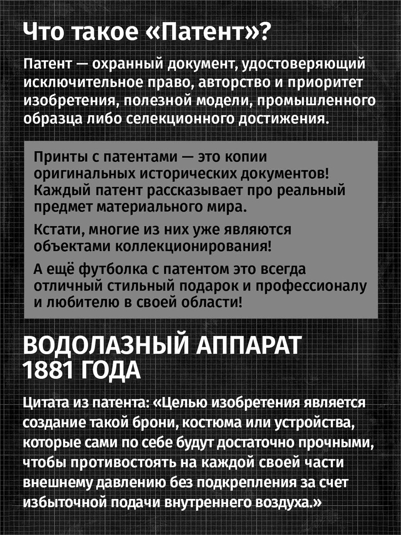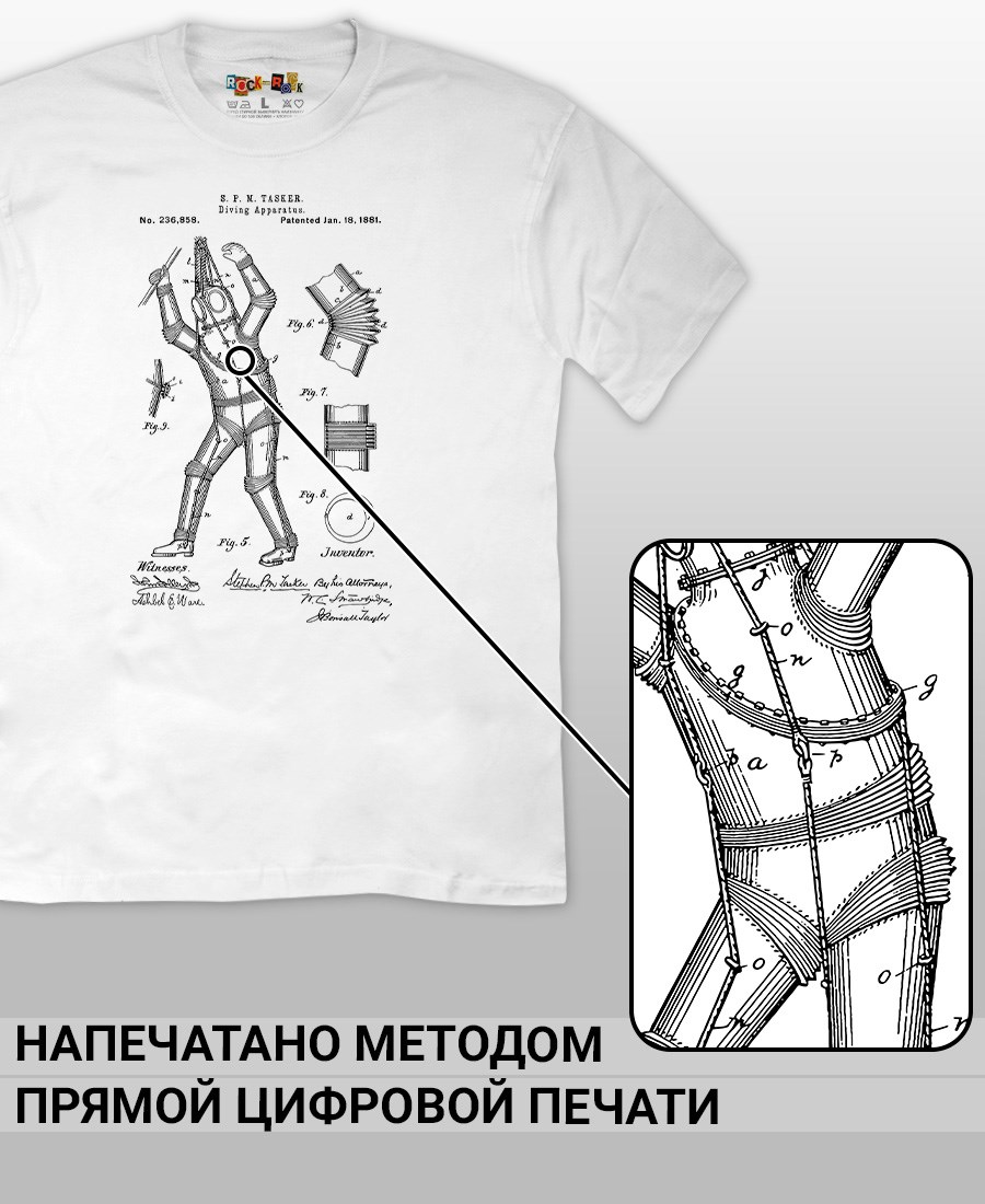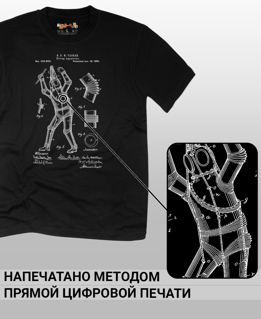 Футболки унисекс, чёрные и белые футболки с изображением патента Водолазный аппарат, 1881 год. Эта модель футболки подходит как мужчинам, так и женщинам, а также адаптируется к различным типам фигуры. Наши принты выполнены методом полноцветной цифровой печати, что обеспечивает высокую износостойкость и насыщенность цветов. Ткань из 100 % хлопка и качественная печать гарантируют сохранение цвета и формы изделия после более чем 100 стирок. В этой серии представлены футболки с патентами на подводные лодки, парусные лодки, шлюпки, такелаж, каноэ, водолазные костюм, компас. Также у нас есть футболки с изображениями патентов на тему Авто, Авиация; Видео и фото; Деньги; Игры и игрушки; Мода, стиль, красота; Мореплавание; Мото и вело; Музыка; Оружие и охота; Профессии и призвания. Ищите также по запросам: футболка для мужчин, мужские футболки, крутая футболка, футболка женская с принтом, футболка мужская с принтом, футболка на день рождения, необычная футболка, необычный подарок, футболка на вечеринку, качественная футболка, шикарная футболка, модная футболка, футболка для подарка, крутая футболка, футболка хайп, подарок парню, подарок девушке, подарок коллекционеру, подарок моряку, подарок яхтеру, подарок яхтсмену, подарок путешественнику, подарок дайверу, подарок речнику, футболка блоггеру, футболка стимпанк, ретро стиль, винтажная, ностальгия, аналоговая эстетика, олдскул техника.