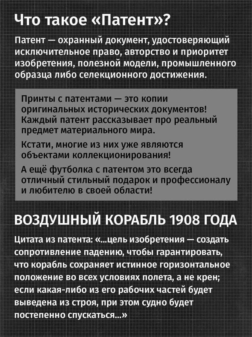 Футболки унисекс, чёрные и белые футболки с изображением патента Воздушный корабль, 1908 год. Эта модель футболки подходит как мужчинам, так и женщинам, а также адаптируется к различным типам фигуры. Наши принты выполнены методом полноцветной цифровой печати, что обеспечивает высокую износостойкость и насыщенность цветов. Ткань из 100 % хлопка и качественная печать гарантируют сохранение цвета и формы изделия после более чем 100 стирок. В этой серии представлены футболки с патентами на летающие машины, воздушный корабль, сверхзвуковой самолёт, аэроплан, самолёт с крыльями типа «чайка», вертолёт, АН-26, АН-12. Также у нас есть футболки с изображениями патентов на тему Авто, Авиация; Видео и фото; Деньги; Игры и игрушки; Мода, стиль, красота; Мореплавание; Мото и вело; Музыка; Оружие и охота; Профессии и призвания. Ищите также по запросам: футболка для мужчин, мужские футболки, крутая футболка, футболка женская с принтом, футболка мужская с принтом, футболка на день рождения, необычная футболка, необычный подарок, футболка на вечеринку, качественная футболка, шикарная футболка, модная футболка, футболка для подарка, крутая футболка, футболка хайп, подарок парню, подарок девушке, подарок летчику, подарок инженеру, футболка автолюбителю, футболка пилоту, футболка ВДВшнику, футболка десантнику.