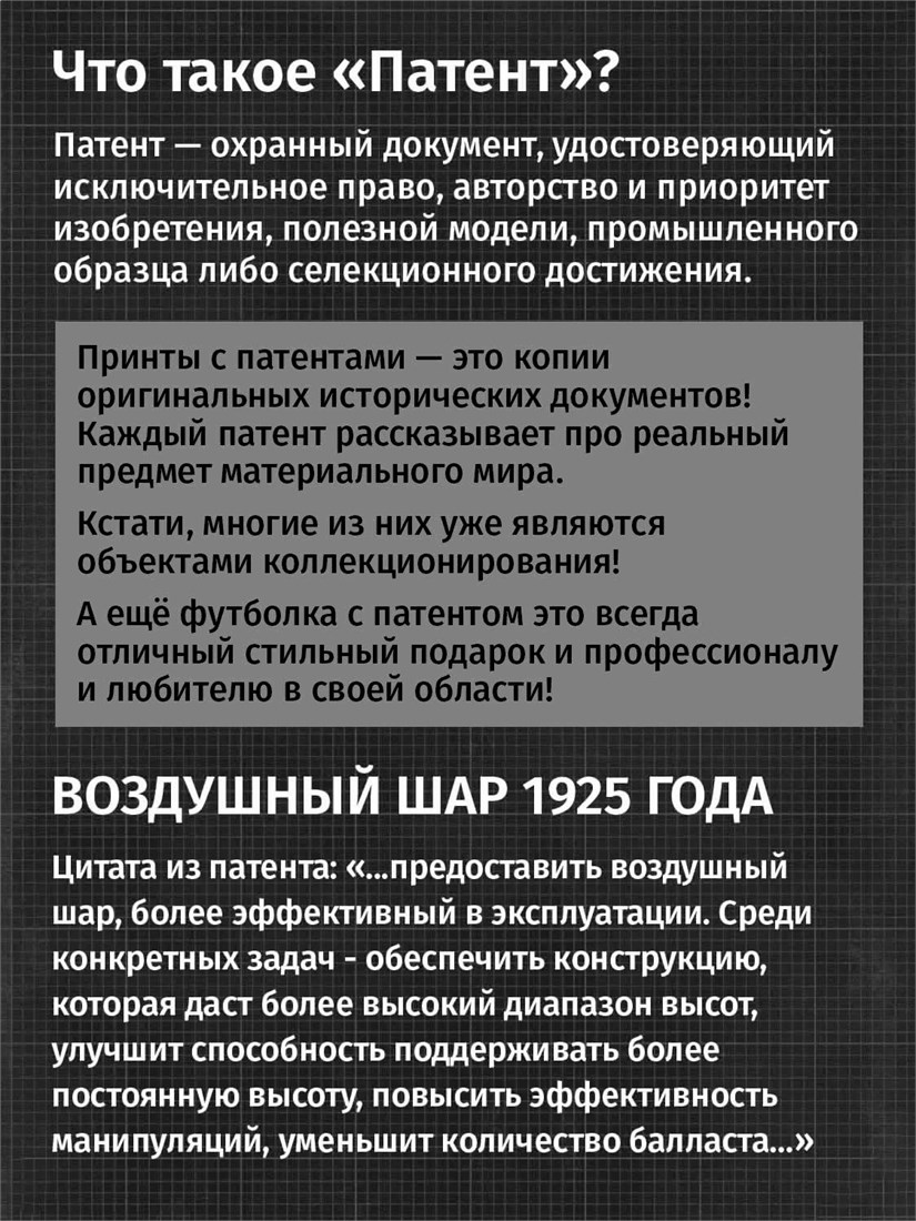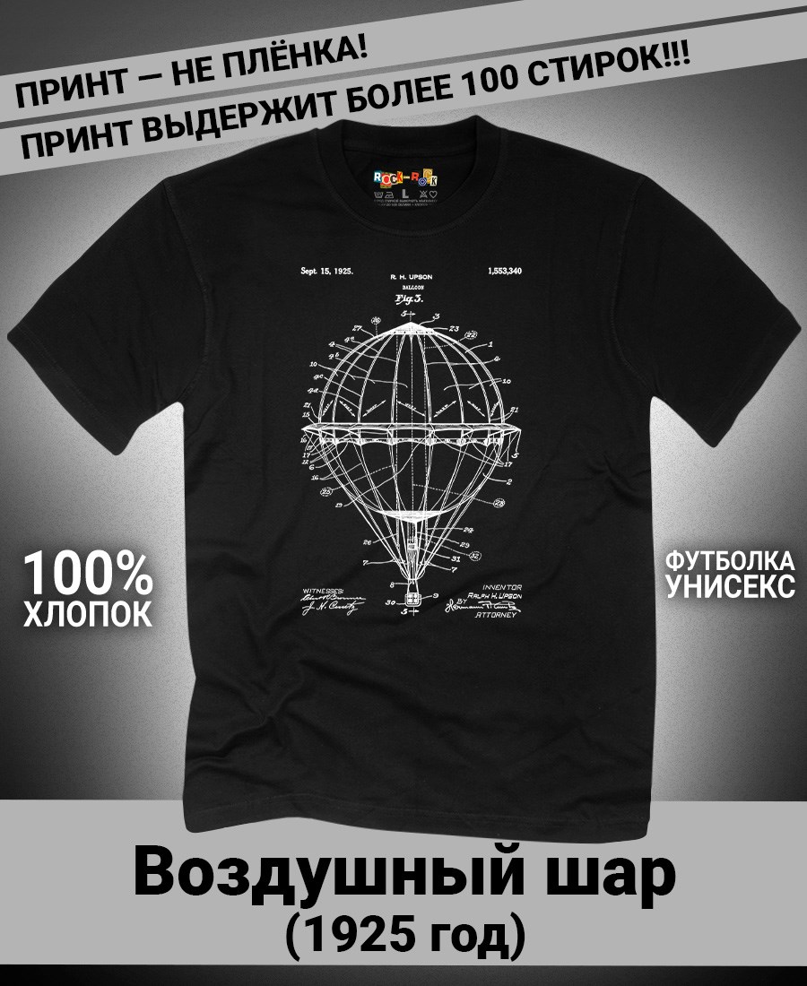 Футболки унисекс, чёрные и белые футболки с изображением патента Воздушный шар, 1925 год. Эта модель футболки подходит как мужчинам, так и женщинам, а также адаптируется к различным типам фигуры. Наши принты выполнены методом полноцветной цифровой печати, что обеспечивает высокую износостойкость и насыщенность цветов. Ткань из 100 % хлопка и качественная печать гарантируют сохранение цвета и формы изделия после более чем 100 стирок. В этой серии представлены футболки с патентами на летающие машины, воздушный корабль, сверхзвуковой самолёт, аэроплан, самолёт с крыльями типа «чайка», вертолёт, АН-26, АН-12. Также у нас есть футболки с изображениями патентов на тему Авто, Авиация; Видео и фото; Деньги; Игры и игрушки; Мода, стиль, красота; Мореплавание; Мото и вело; Музыка; Оружие и охота; Профессии и призвания. Ищите также по запросам: футболка для мужчин, мужские футболки, крутая футболка, футболка женская с принтом, футболка мужская с принтом, футболка на день рождения, необычная футболка, необычный подарок, футболка на вечеринку, качественная футболка, шикарная футболка, модная футболка, футболка для подарка, крутая футболка, футболка хайп, подарок парню, подарок девушке, подарок летчику, подарок инженеру, футболка автолюбителю, футболка пилоту, футболка ВДВшнику, футболка десантнику.