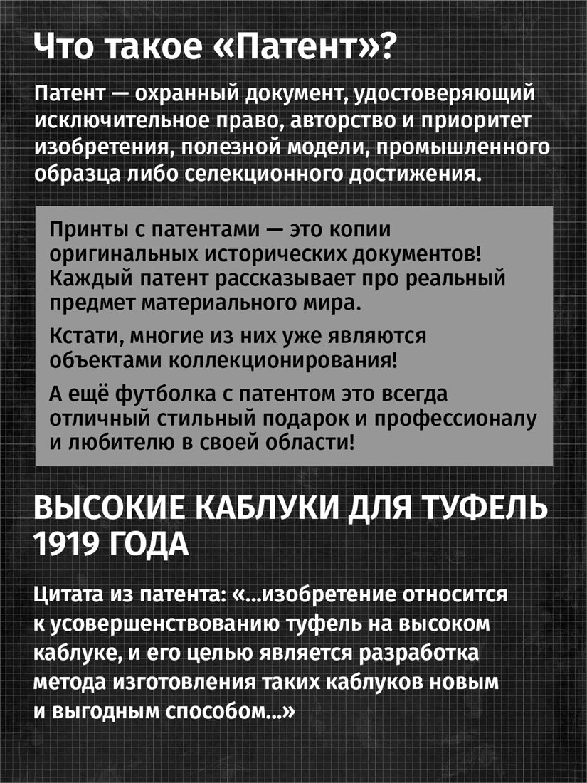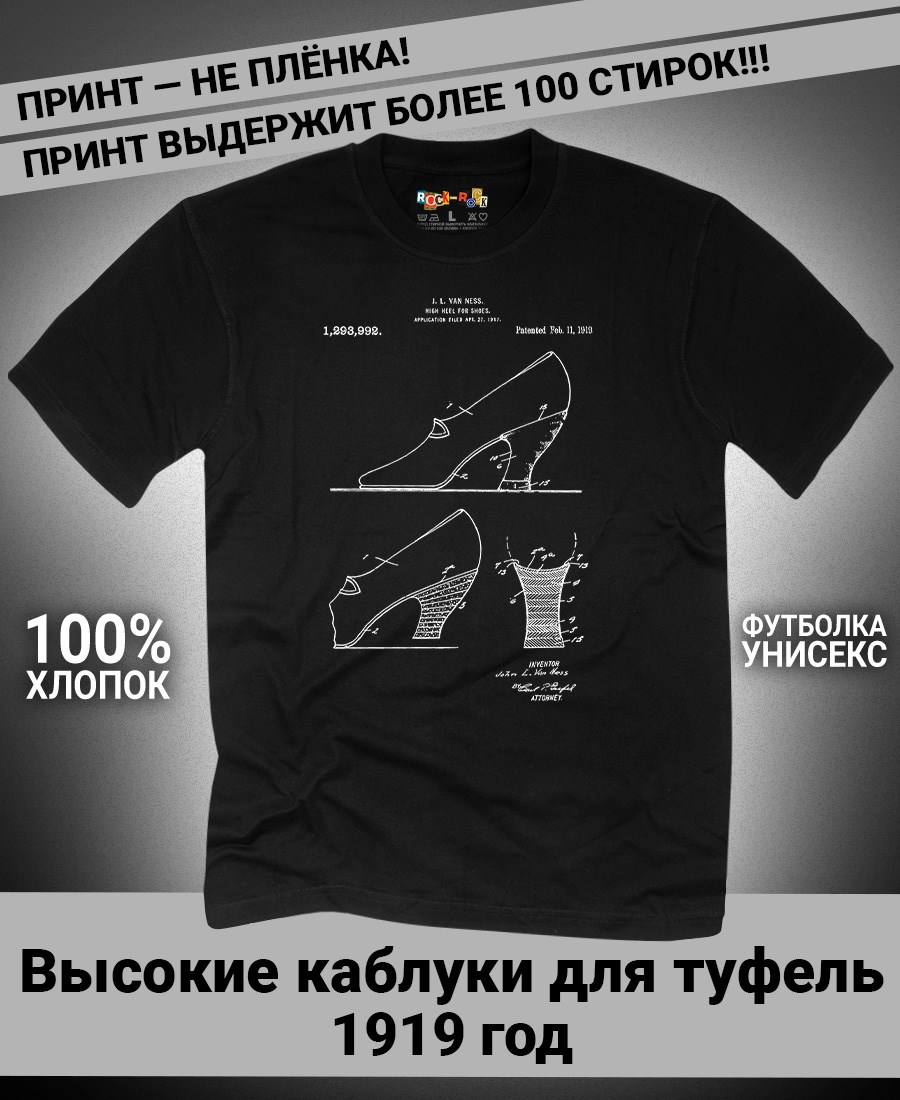 Футболки унисекс, чёрные и белые футболки с изображением патента Высокие каблуки для туфель, 1919 год. Эта модель футболки подходит как мужчинам, так и женщинам, а также адаптируется к различным типам фигуры. Наши принты выполнены методом полноцветной цифровой печати, что обеспечивает высокую износостойкость и насыщенность цветов. Ткань из 100 % хлопка и качественная печать гарантируют сохранение цвета и формы изделия после более чем 100 стирок. В этой серии представлены футболки с патентами на парикмахерские ножницы, опасную бритву, флакон для духов, футляр для помады, несессер, портновский манекен. Также у нас есть футболки с изображениями патентов на тему Авто, Авиация; Видео и фото; Деньги; Игры и игрушки; Мода, стиль, красота; Мореплавание; Мото и вело; Музыка; Оружие и охота; Профессии и призвания. Ищите также по запросам: футболка для мужчин, мужские футболки, крутая футболка, футболка женская с принтом, футболка мужская с принтом, футболка на день рождения, необычная футболка, необычный подарок, футболка на вечеринку, качественная футболка, шикарная футболка, модная футболка, футболка для подарка, крутая футболка, футболка хайп, подарок парню, подарок девушке, подарок коллекционеру, подарок модельеру, подарок парикмахеру, подарок бьюти-блогеру, подарок стилисту, подарок швее, подарок барберу, футболка блоггеру, футболка стимпанк, ретро стиль, винтажная, ностальгия, аналоговая эстетика, олдскул техника.