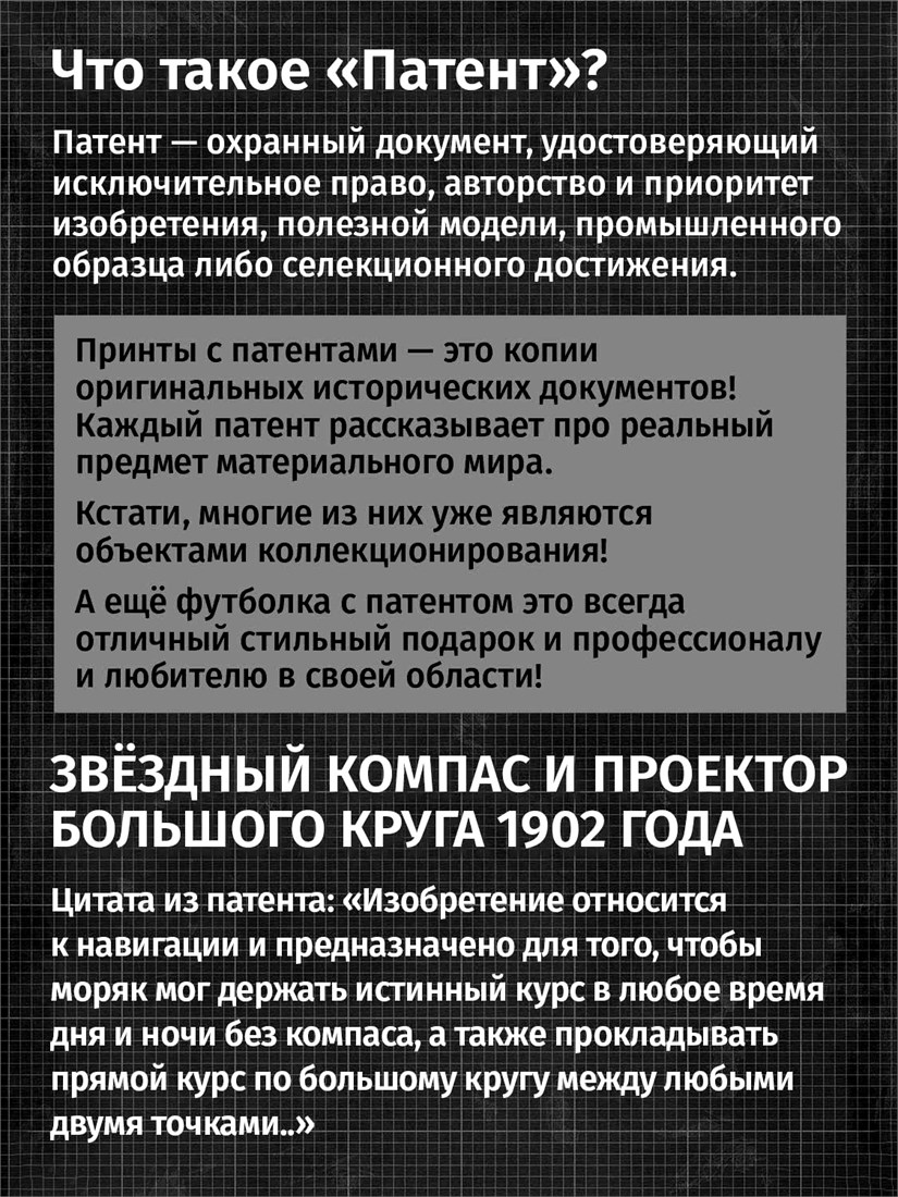 Футболки унисекс, чёрные и белые футболки с изображением патента Звёздный компас и проектор большого круга, 1902 год. Эта модель футболки подходит как мужчинам, так и женщинам, а также адаптируется к различным типам фигуры. Наши принты выполнены методом полноцветной цифровой печати, что обеспечивает высокую износостойкость и насыщенность цветов. Ткань из 100 % хлопка и качественная печать гарантируют сохранение цвета и формы изделия после более чем 100 стирок. В этой серии представлены футболки с патентами на подводные лодки, парусные лодки, шлюпки, такелаж, каноэ, водолазные костюм, компас. Также у нас есть футболки с изображениями патентов на тему Авто, Авиация; Видео и фото; Деньги; Игры и игрушки; Мода, стиль, красота; Мореплавание; Мото и вело; Музыка; Оружие и охота; Профессии и призвания. Ищите также по запросам: футболка для мужчин, мужские футболки, крутая футболка, футболка женская с принтом, футболка мужская с принтом, футболка на день рождения, необычная футболка, необычный подарок, футболка на вечеринку, качественная футболка, шикарная футболка, модная футболка, футболка для подарка, крутая футболка, футболка хайп, подарок парню, подарок девушке, подарок коллекционеру, подарок моряку, подарок яхтеру, подарок яхтсмену, подарок путешественнику, подарок дайверу, подарок речнику, футболка блоггеру, футболка стимпанк, ретро стиль, винтажная, ностальгия, аналоговая эстетика, олдскул техника.